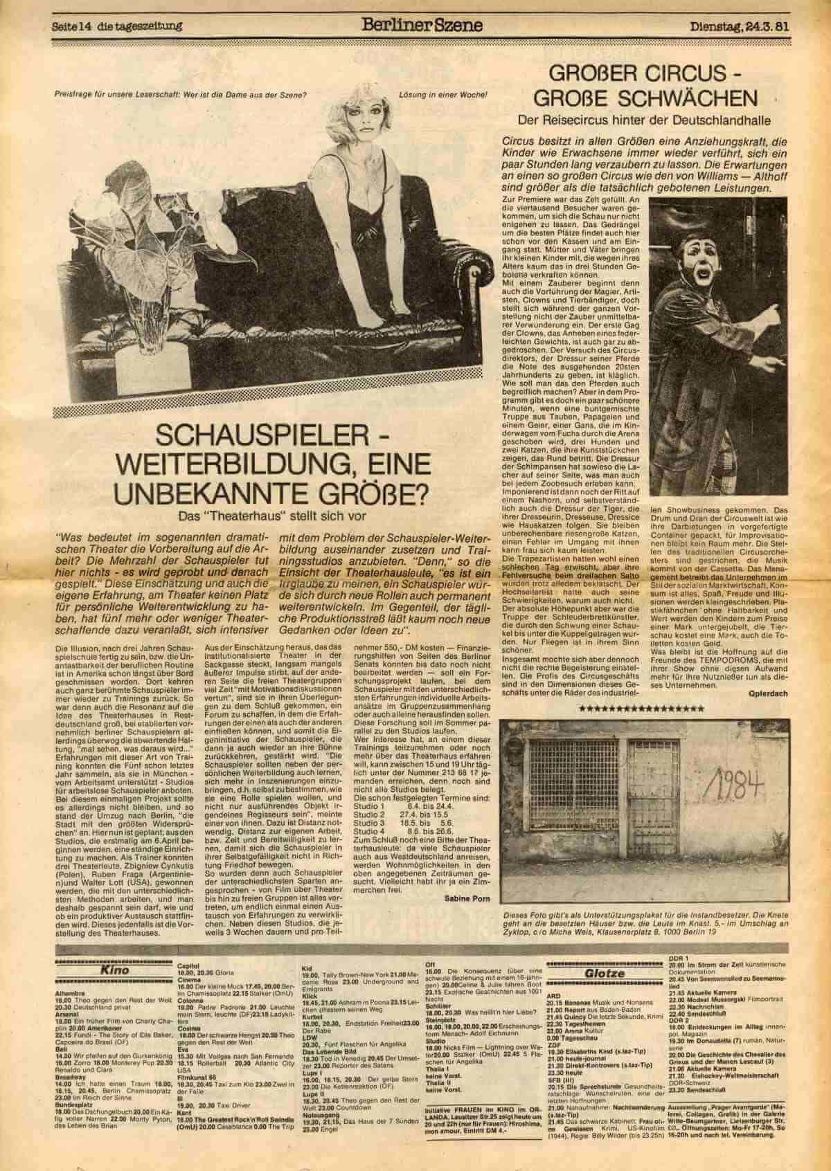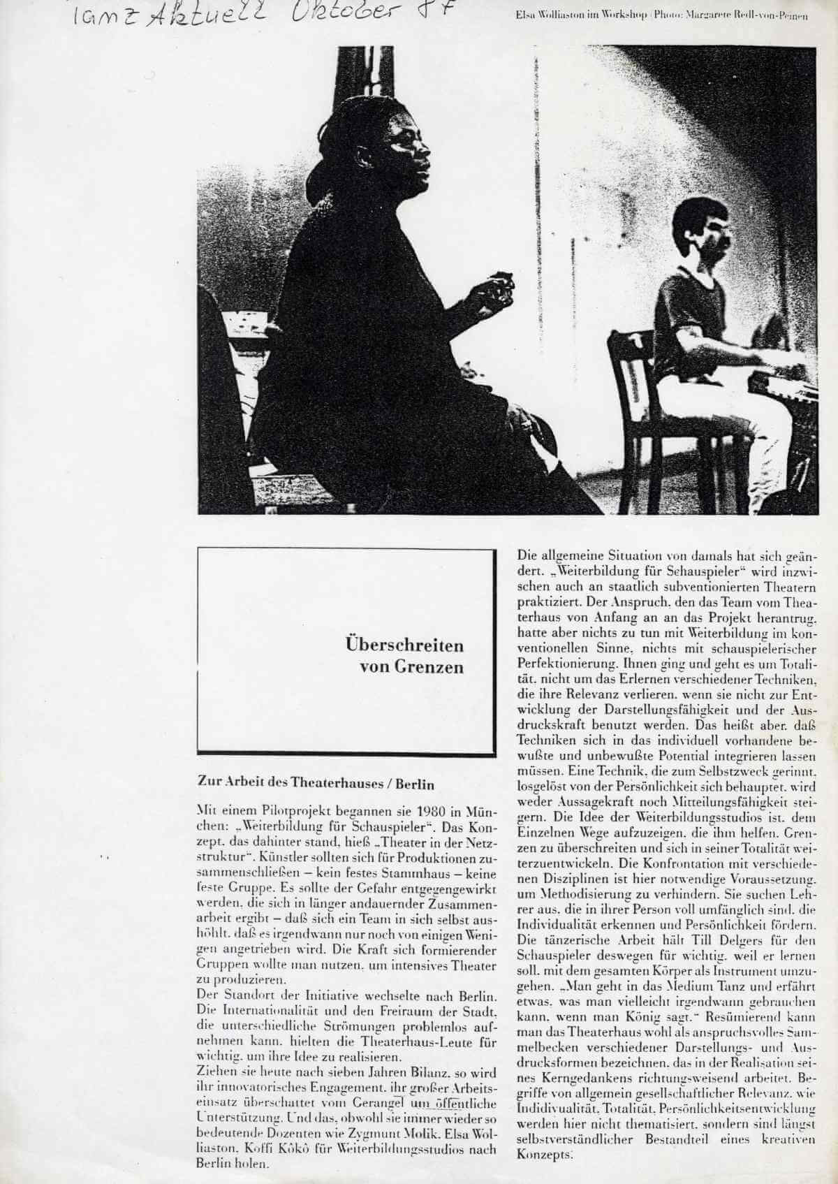 Rina Yerushalmi ist Regisseurin (u.a. LA MAMA Theater New York) und Choreographin. Sie unterrichtet Schauspiel an der N.Y. University und ist Dozentin am Feldenkrais-Institut in Israel. Sie studierte Schauspiel in London und USA; No-Theater in Japan. Ihr Bewegungstraining basiert auf der Graham-Technik, Laban-Technik und Freier Tanz Improvisation. 12 Jahre Studium mit MOSHE FELDENKRAIS: Die Arbeit ist aufgebaut auf Bewegungs- (Feldenkrais) und Stimmtraining. In der Monologarbeit ist eingeschlossen: Rhythmus der Sprache, Struktur des Atems, Benutzung von Sprachbildern und Textanalyse. In der individuellen Rollenarbeit werden die persönlichen Gefühle und Ansichten mit jenen der Textfigur verbunden. Jede menschliche Handlung besteht aus vier Elementen: Bewegung, Wahrnehmung, Gefühl und Gedanke. Ein frei fliessendes Wechselspiel dieser Elemente ermöglicht eine grössere Auswahl der schauspielerischen Mittel und Spontanität im Spiel. Ein flexibler Schauspieler muss ein Instrument haben, in dem alle vier Elemente ganz integriert sind, d.h. dass alle Teile gleich zugänglich, sensitiv, expressiv und fähig zur Reaktion sind. Erst wenn der Schauspieler diesen Stand erreicht, kann freies Spiel beginnen.