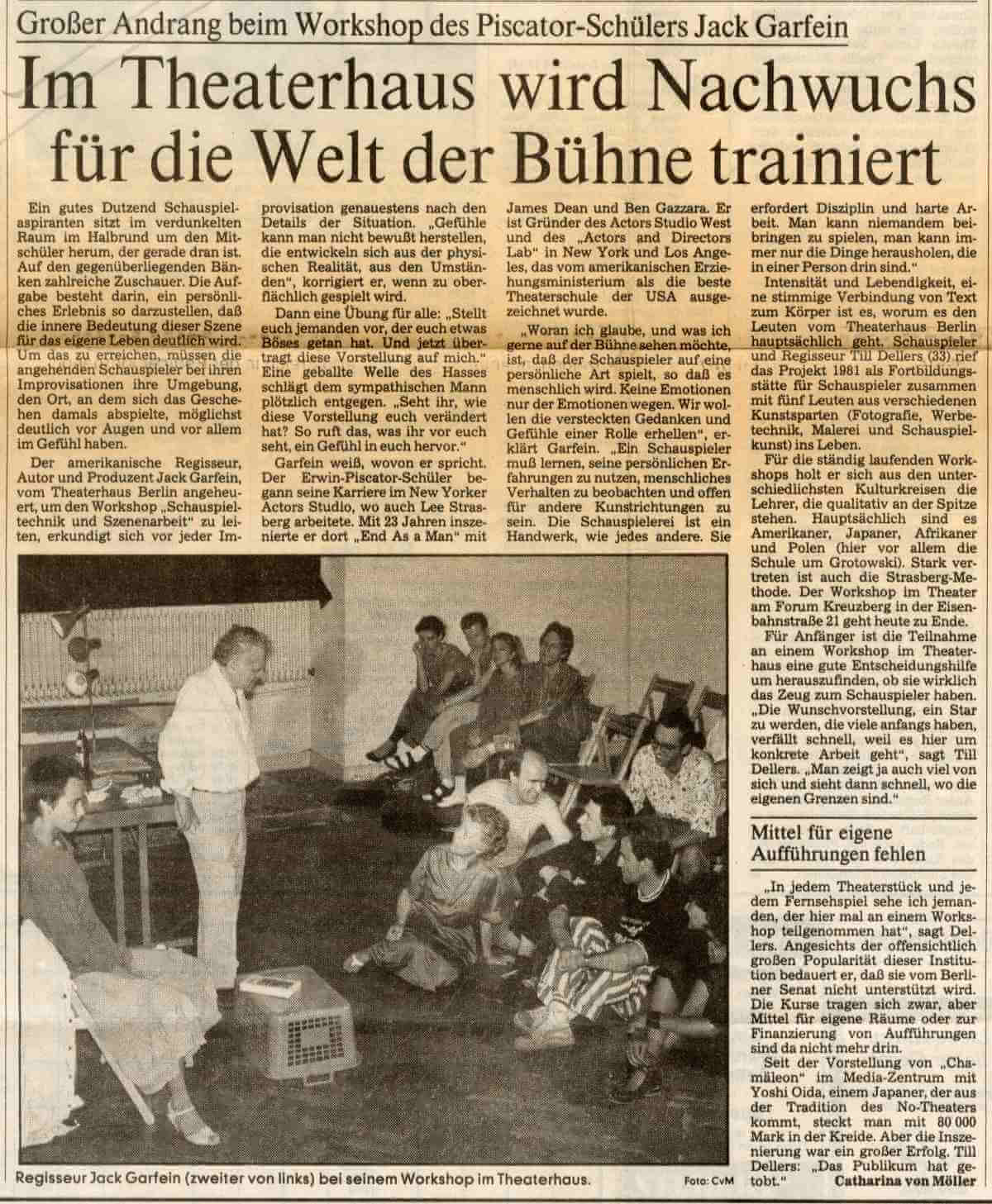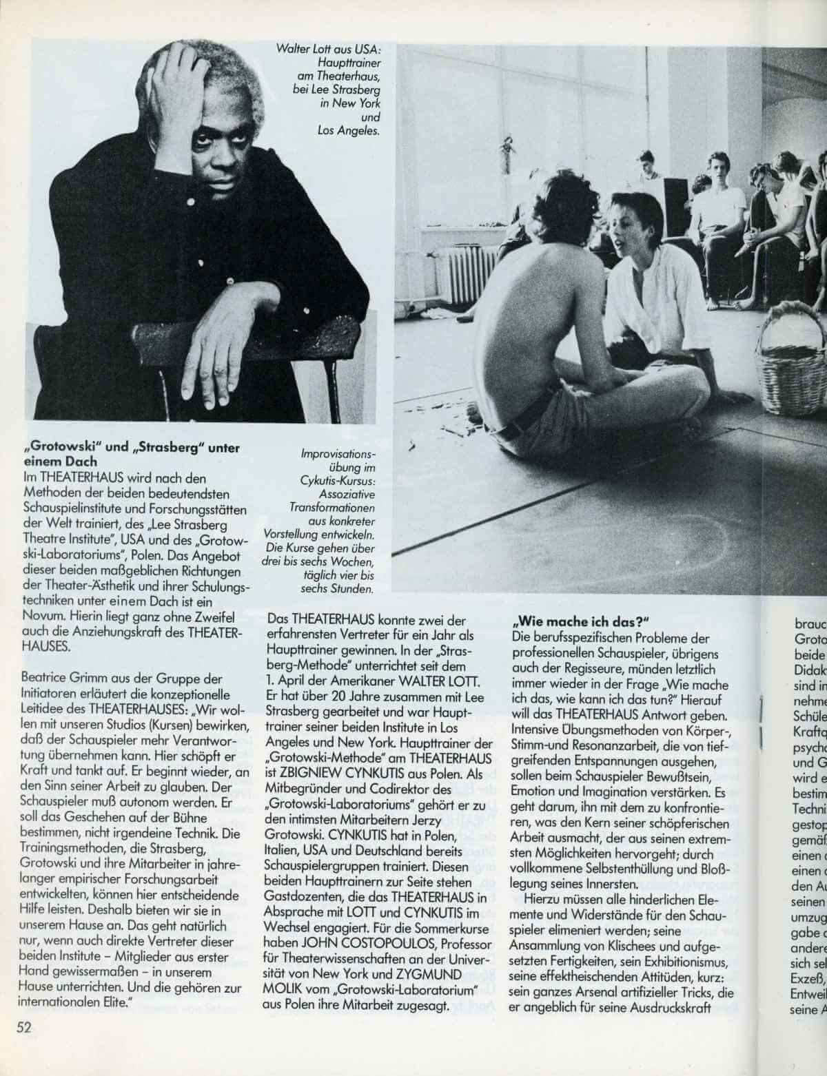 Walter Lott arbeitet 20 Jahre mit Lee Strasberg. Als Mitglied des Actor’s Studio New York war er über Jahre einer der Haupttrainer am Strasberg-Institut Los Angeles. Seine intensive Übungsmethode, die von tiefgreifender Entspannung unter Entwicklung des Sinnesgedächtnisses ausgeht, verstärkt beim Schauspieler Bewusstsein, Emotion und Imagination. In der szenischen Darstellung wird die Arbeit am Sinnesgedächtnis einbezogen um imaginäre Realitäten zu kreieren. Die Erforschung von wirkungsvolleren Arbeitsweisen vertieft Kontakte, Beziehungen und Interaktionen in der Ensemblearbeit.