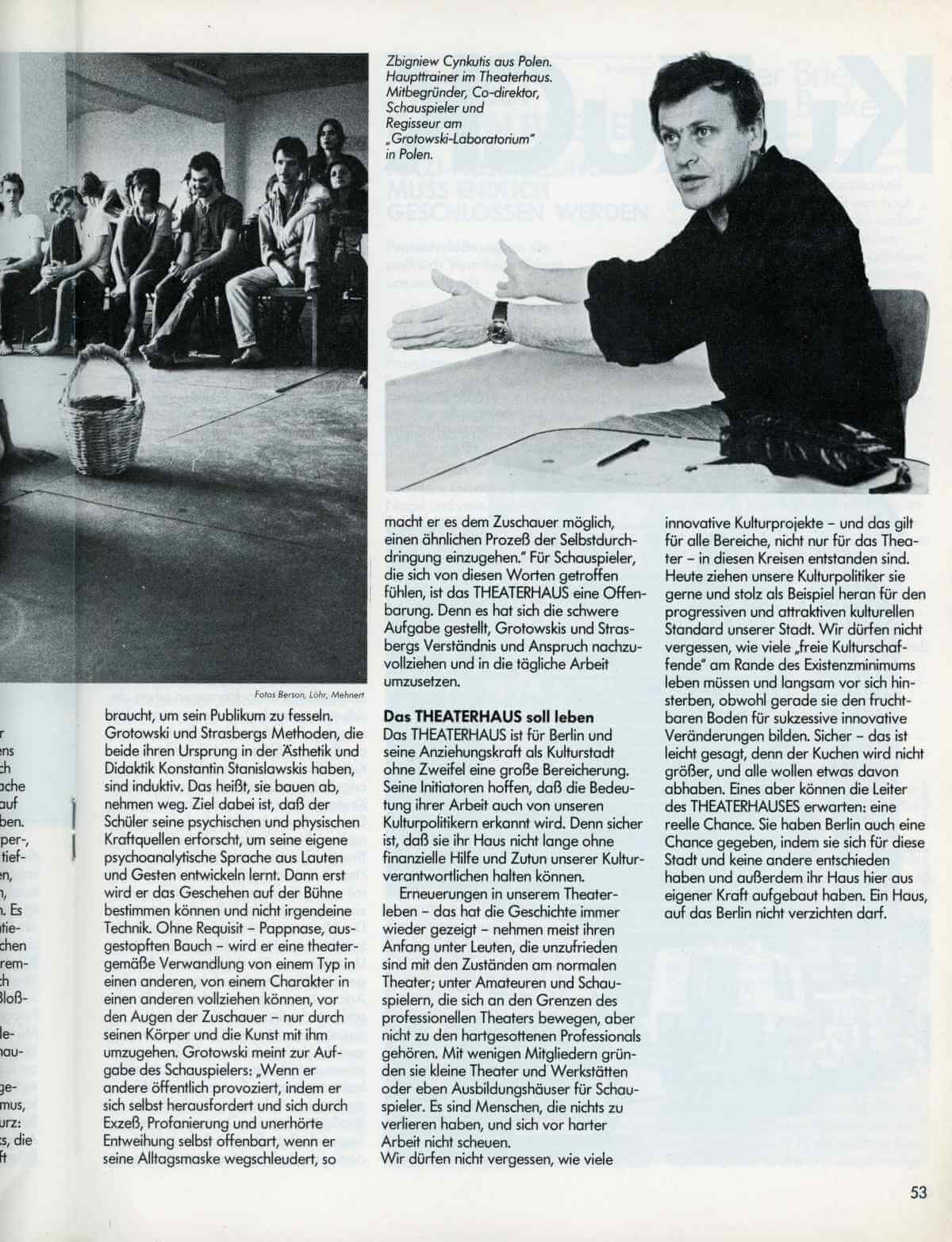 Zbigniew Cynkutis war Mitbegründer und Co-Direktor des Grotowski-Laboratoriums in Polen. Er trainierte Schauspieler in Polen, Italien, Deutschland und USA. Ausgehend von intensiver Körper-, Stimm- und Resonanzarbeit wird in speziellen Improvisationsstrukturen vor allem die Präsenz des Schauspielers gefordert. Seine Untersuchungen der physischen Reproduktion vermitteln dem Schauspieler die Wiederholbarkeit von lebendigem Ausdruck auf der Bühne.