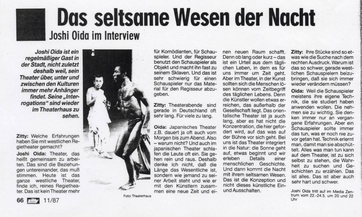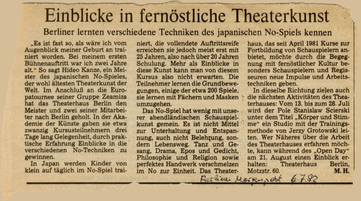 Carlotta Ikeda gehört zur zweiten Generation des Butoh-Tanzes, jenes `Tanzes der Finsternis', der Anfang der 60er Jahre in Japan als Impuls gegen die westlichen - vornehmlich amerikani¬sche - Überfremdung entstand. Nach einer Ausbildung in Modern Dance wandte sich Carlotta Ikeda unter dem Eindruck von Hiji¬kata, dem Mitbegründer des Butoh, jenem mystisch irrationalen Tanz zu. In den frühen 70er Jahren gründete Carlotta Ikeda ihre eigene - rein weibliche - Compagnie `Ariadone', mit der sie seither erfolgreich in Japan und der ganzen Welt unterwegs ist. Als Choreographin und auch als Solo-Performerin zählt Carlotta Ikeda heute zu den wichtigsten Vertretern des Butoh. Carlotta Ikedas pädagogische Arbeit setzt an bei einem intensiven Kör¬pertraining mit einem Auge auf Details - besonders auf das Spiel der Füße. Daran anschließend werden fernöstliche Merk¬male der Bewegungsstruktur in den Körper aufgenommen und so Grundelemente des Butoh entwickelt. Ziel ist es, die Befähi¬gung zu erlangen, anspruchsvolle Choreographiefolgen - auch als Carlotta Ikedas eigenen Kreationen - nachvollziehen zu können und auf den `europäischen Körper' zu übertragen. „Wir wollen Butoh nicht als Stil festlegen. Im Gegenteil: Wir lehnen das ab, um frei zu sein, alle Möglichkeiten unseres Körpers zu erforschen.“ Dabei ist wichtig für alle Einflüsse offen zu sein: „Wenn mich etwas beeinflusst, dann das Hier und Jetzt – und nicht die Dinge, die ich in der Vergangenheit erfahren habe. Ich bin ein Echo aller Dinge, die gerade hier und jetzt durch mich hindurchfließen.“