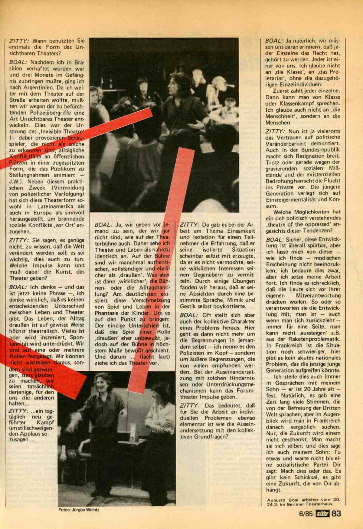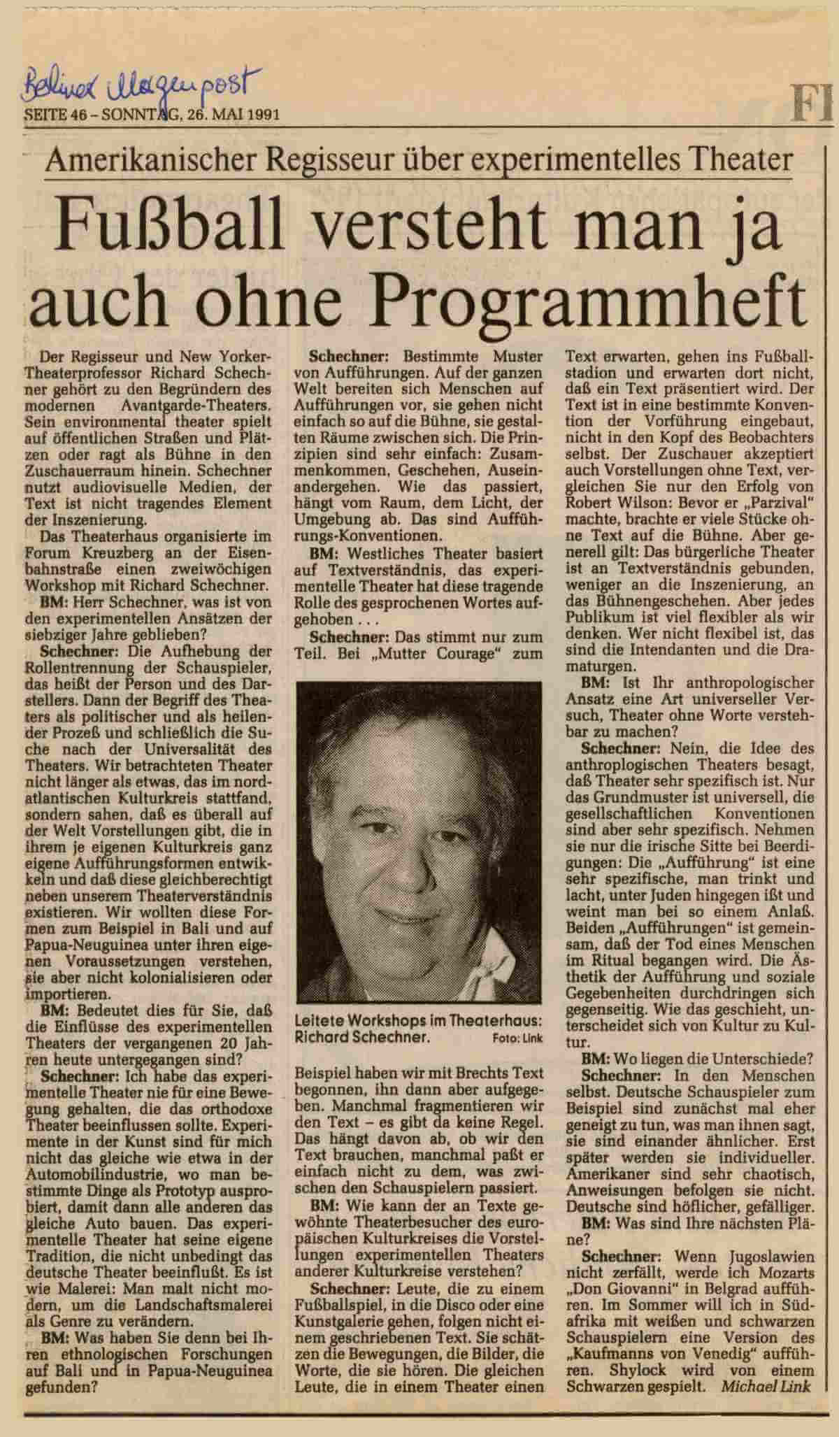 Richard Schechner ist Regisseur, Schauspielpädagoge und Autor theatertheoretischer Schriften- Gründer und Leiter der PERFORMANCE GROUP, New York. Ausgedehnte Reisen nach Asien, wo er asiatisches Theater und Rituale studierte. Seit 1967 lehrt Schechner an der N.Y. University Theateranthropologie Schwerpunkt in der Arbeit ist das Training des „freien Erzählens“, ausgehend von speziellen Atmungs- und Bewegungsübungen.
