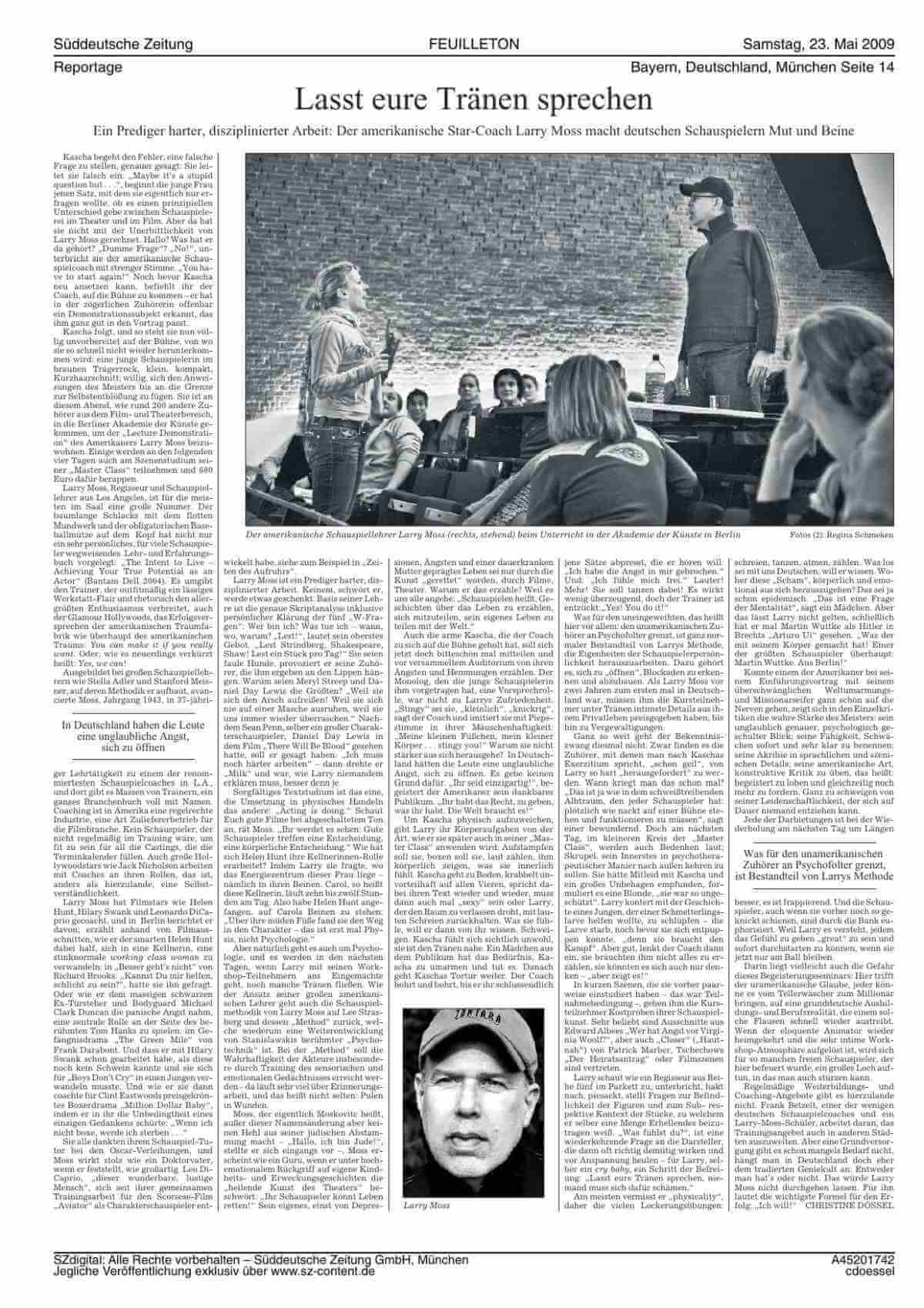 Meisner Technique, lange Zeit Geheimtipp in amerikanischen Schauspielkreisen, in England bereits seit längerem etabliert, findet nun auch hier Aufmerksamkeit. Sanford Meisner, einer der Mitbegründer des legendären Group Theater, kreierte eine schauspielerische Herangehensweise, die ganz im Instinkt des Schauspielers verwurzelt ist und spiel¬erische Spontaneität und Wahrhaftigkeit des Tuns in Ausdruck und Zusammenspiel bewirkt. Larry Silverberg studierte bei Sanford Meisner selbst und ist ein erfahrener und enthusiastischer Lehrer dieser Methode. Er ist international als Autorität und als Autor einer Serie von vier Büchern zum Umgang mit Meisner Technique anerkannt: „The Sanford Meisner Approach I-IV“. Diese Arbeitsbücher behandeln die schauspielerischen Herausforderungen hinsichtlich lebendiger und wahrhaftiger Verkörperung auf der Basis der Meisner Technique. Er ist zudem Autor von „Loving to Audition“, „The Actor’s Guide to Qualified Acting Coaches“ und „The 7 Simple Truths of Acting“. Diese Meisterklasse zum Thema „echtes, wahrhaftiges Schauspiel“ führt in die Arbeitsweisen der Sanford Meisner Technique ein. Die Schauspieler werden durch eine Abfolge von Übungen geführt, um die Werkzeuge und den Nutzen dieser Herangehensweise kennen zu lernen. Ziel ist, den Schauspieler zu authentischer, einfacher und leidenschaftlicher Verkörperung zu befähigen. Grundlage der Meisner Technique ist Repetition/Wiederholung, eine radikale Schulung der Wahrnehmung des Erlebens und Verhaltens im Kontakt mit dem Partner. Hinzu kommen vorbereitete Elemente, wobei das unmittelbare Geschehen immer Priorität vor der vorbereiteten inneren Arbeit hat. Hier grenzt sich Meisner Technique klar von eher introvertierenden Herangehensweisen ab und gibt der Spontaneität des Spielens im Moment den Vorzug. Damit entsteht Raum für Kreativität und Improvisation im lebendigen Zusammenspiel. Larry Silverberg betont, dass uns die Kunst des Schauspiels letztendlich mit den größeren Wahrheiten des Lebens verbinden muss. Als Schauspieler müssen wir uns immer wieder darauf einlassen, unsere Herzen und unseren Geist erwecken, berühren und bewegen zu lassen. In diesem Sinne ist Larry Silverberg ein inspirierender Lehrer.