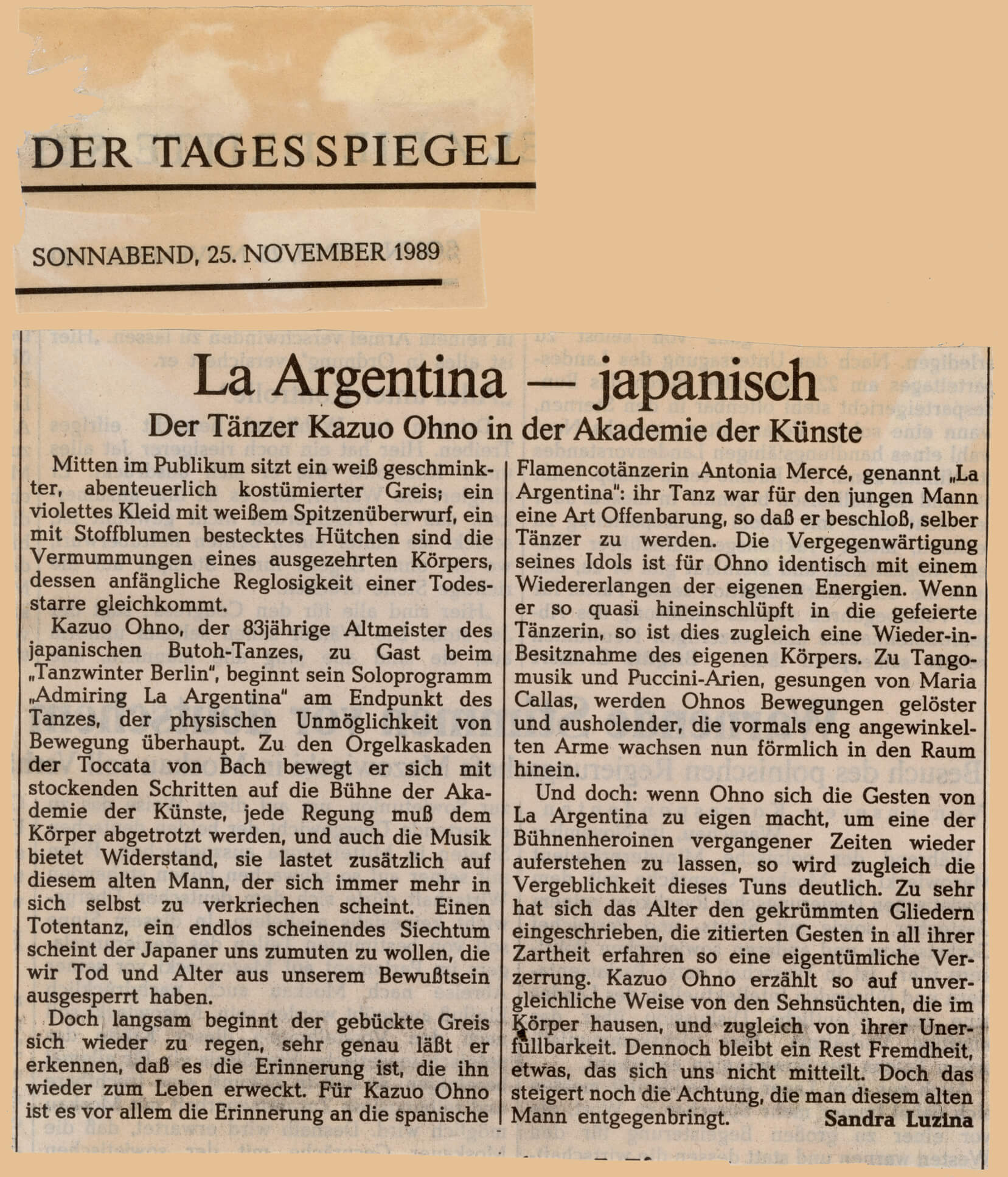 Kazuo Ohno initiierte gemeinsam mit Tatsumi Hijkata den Butoh, Seine Ausbildung hatte Kazuo Ohno im modernen Tanz erhalten, unter dem Einfluss des deutschen Expressionismus wie ihn Mary Wigman und Harald Kreutzberg vertrat. Von 1933 an besuchte Ohno die Schule von Baku Ishii, der als einer der ersten im neuen Tanz ausgebildet worden war, und nahm von 1936 an Unterricht bei Takaya Eguchi, der seinerseits bei Mary Wigman studiert hatte. 1954 begegnen sich Kazuo Ohno und Tatsumi Hijkata. Ihre Zusammenarbeit trägt 1959 zum ersten Mal Früchte mit dem Tanzkonzert „Der alte Mann und das Meer“. Ohno kreiert in Folge unter der Choreographie von Hijkata mehrere Tanzstücke. Seit 1969 dreht er Tanzfilme unter der Regie von Chiaki Nagano, die ohne Erzählstruktur auf poetische und surrealistische Sequenzen aufgebaut sind. Kazuo Ohno sieht in seinen Schülern keine Interpreten seiner Erfahrungen und Ideen. Die Zusammenarbeit dient dem gemeinsamen Streben nach dem gleichen Ziel. Sehr persönliche Inhalte tänzerisch so umzusetzen, dass sich darin ihr universelles Wesen zeigt und für jeden, nicht zuletzt für den Tänzer selbst, erkennbar wird. Kurz gesagt, die Objektivierung subjektiver Erfahrungen. Yoshito Ohno, der Sohn des Altmeisters Kazuo Ohno, studierte sehr früh den jungen rebellischen Butoh-Tanz aus erster Quelle: mit seinem Vater und auch mit dem Schöpfer des „Tanzes der Finsternis“ Tatsumi Hijkata. Yoshito Ohno war der Protagonist in Hijkatas kurzem Stück „Kinijiki“ (Verbotene Farbe), das 1959 in Tokio zum Eklat führte und gleichzeitig die Geburt des Butoh einläutete. Er war Mitglied mehrerer Butoh-Tanzgruppen, wie „Tatsumi Hijkatas Dance Experience Group“ und „650 Years Dance Experience Company“. Seit 1985 ist Yoshito Ohno auf Gastspielreisen in Europa, Australien, Brasilien und den USA, oftmals für gemeinsame Auftritte mit seinem Vater unterwegs.