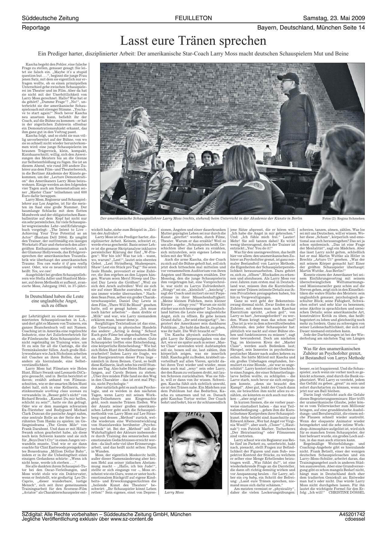Larry Moss lernte bei großen Schauspiellehrern wie Stella Adler und Sanford Meisner. Er arbeitete mit Hingabe gegen alle inneren und äußeren Widerstände an seinem Traum, als professioneller Schauspieler anerkannt zu werden. Seine tiefgehende Auseinandersetzung mit sich selbst, der Schauspielkunst und den handwerklichen Voraussetzungen bringt er jetzt als Lehrer ein. Er gehört zur neuen Generation der Schauspiellehrer, die sich nicht auf die Nachfolge einer „legendären Lehrerpersönlichkeit“ einengen lassen, sondern in ihrer Arbeit vereinen, was den kreativen Prozess des Schauspielers unterstützt, und dabei eigene Übungen entwickeln.