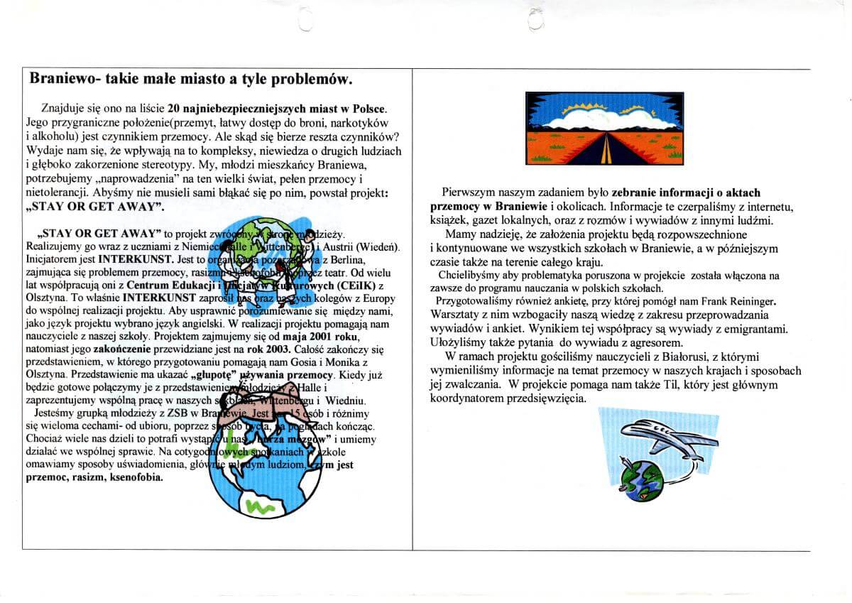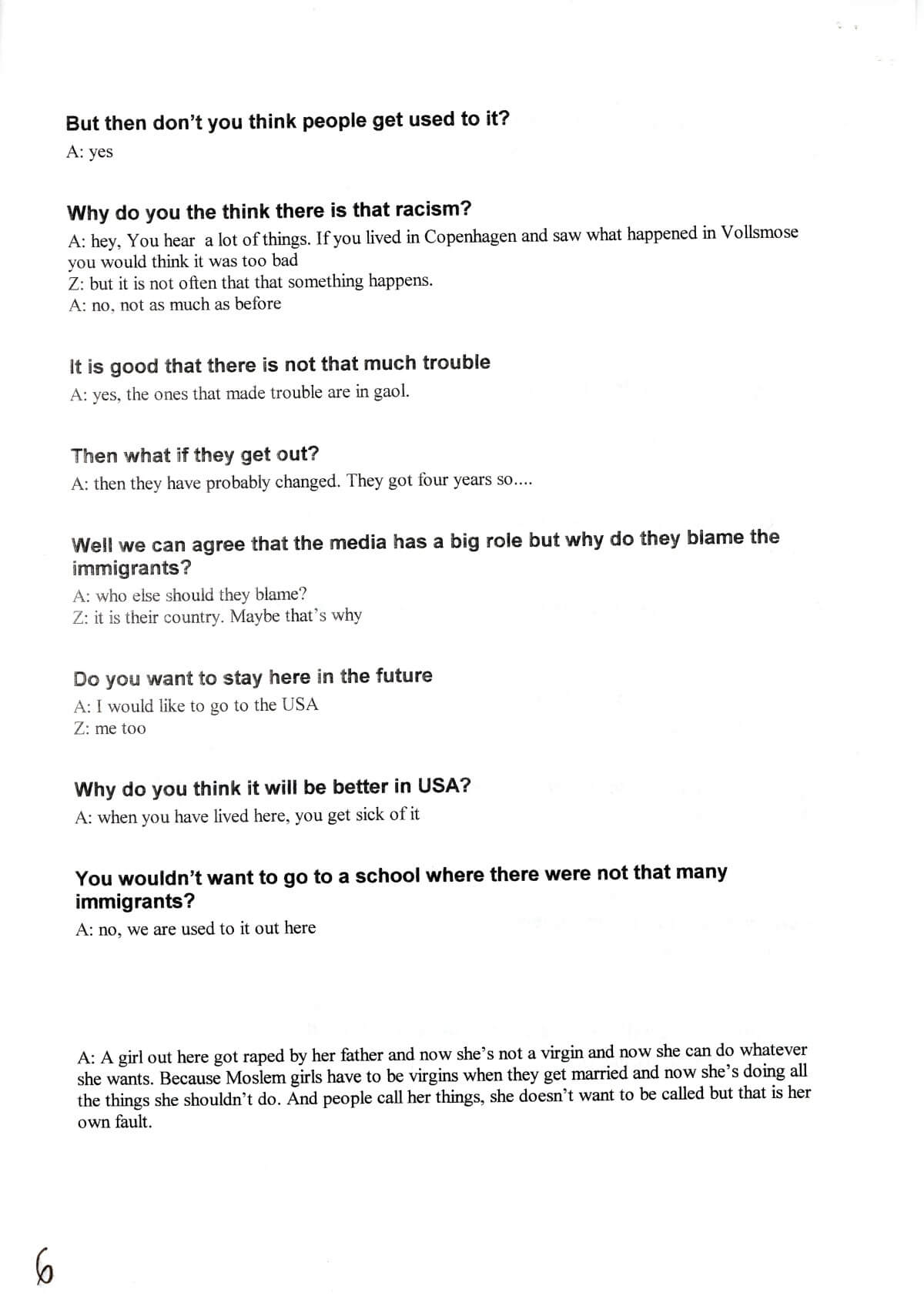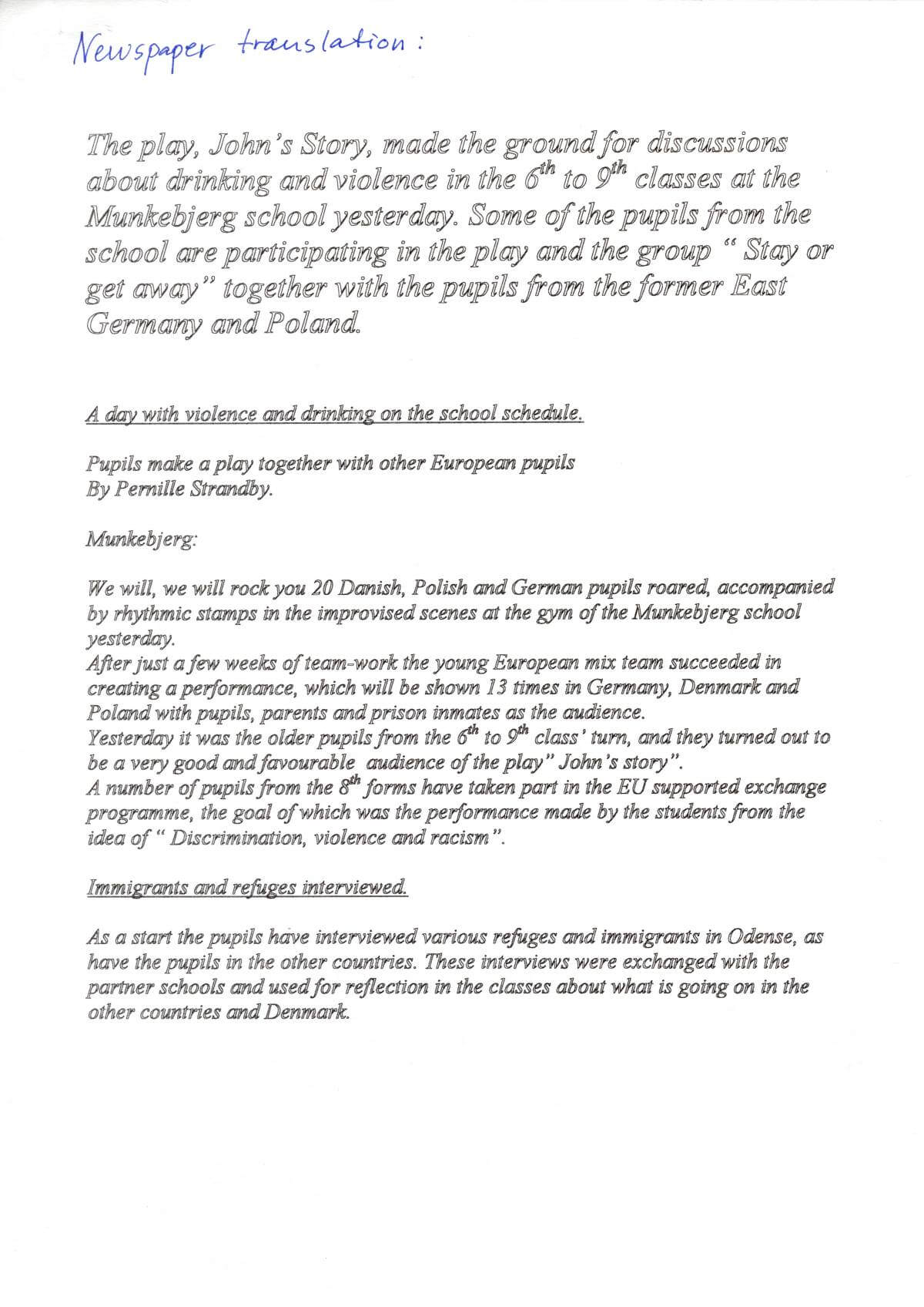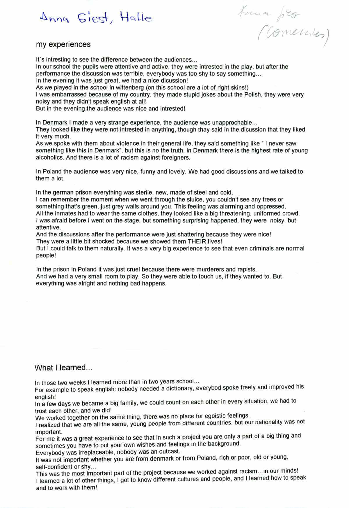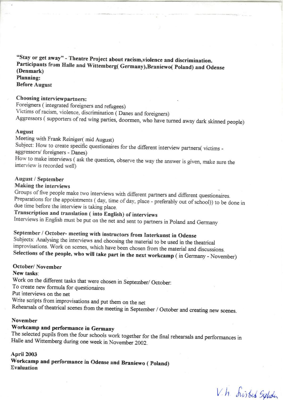 Schüler erarbeiten einen Fragenkatalog zum Thema: Antwort der Jugendkultur zum Verhalten von Gewalt und Rassismus. Gemeinsam werden die besten Fragen ausgesucht und gestellt an Personen gleichen und verschiedenen Alters, an Bekannte, Verwandte, Fremde.