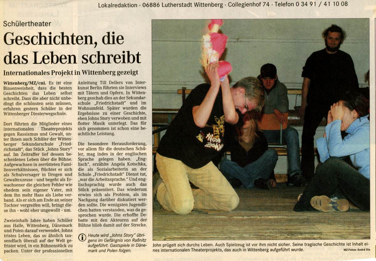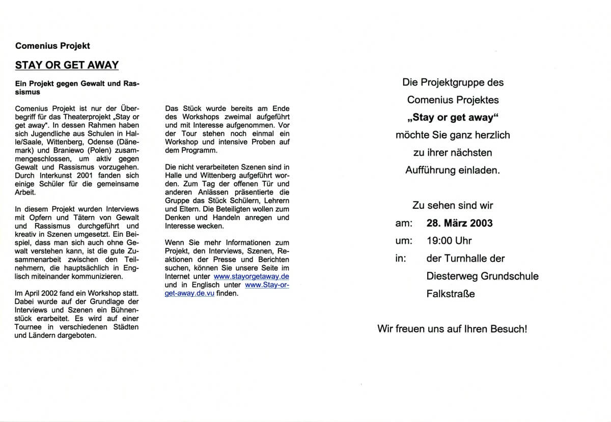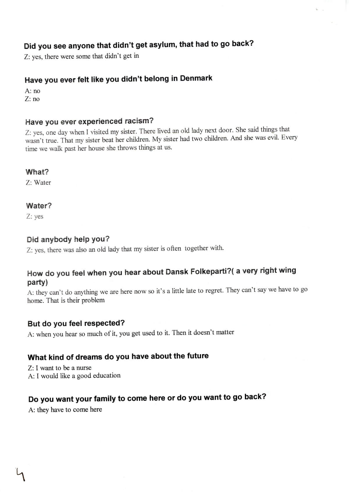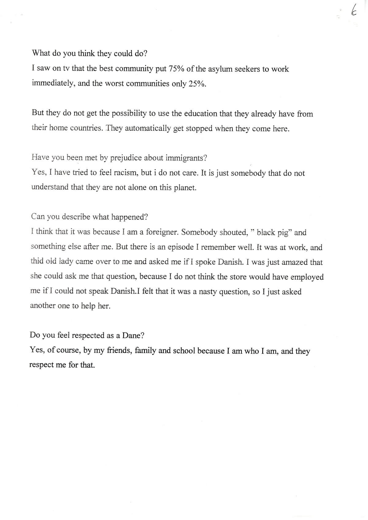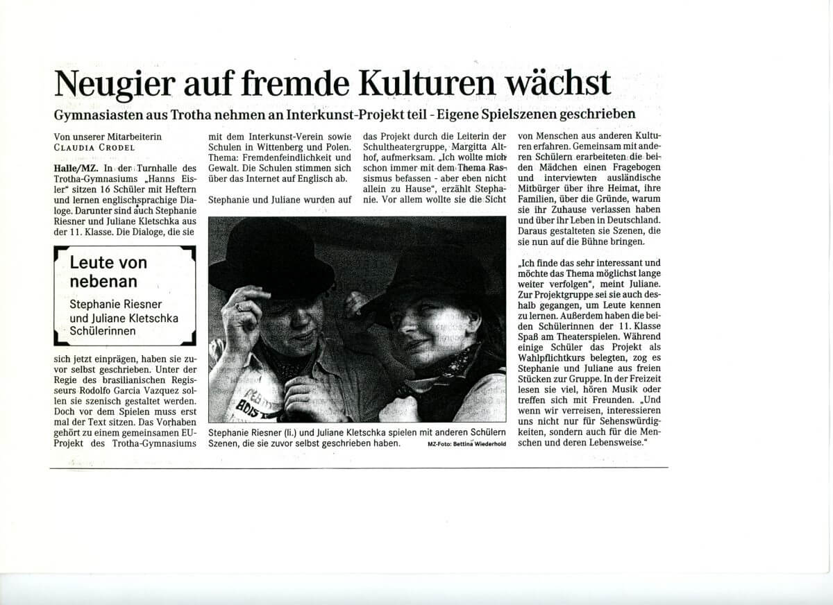 Schüler erarbeiten einen Fragenkatalog zum Thema: Antwort der Jugendkultur zum Verhalten von Gewalt und Rassismus. Gemeinsam werden die besten Fragen ausgesucht und gestellt an Personen gleichen und verschiedenen Alters, an Bekannte, Verwandte, Fremde.