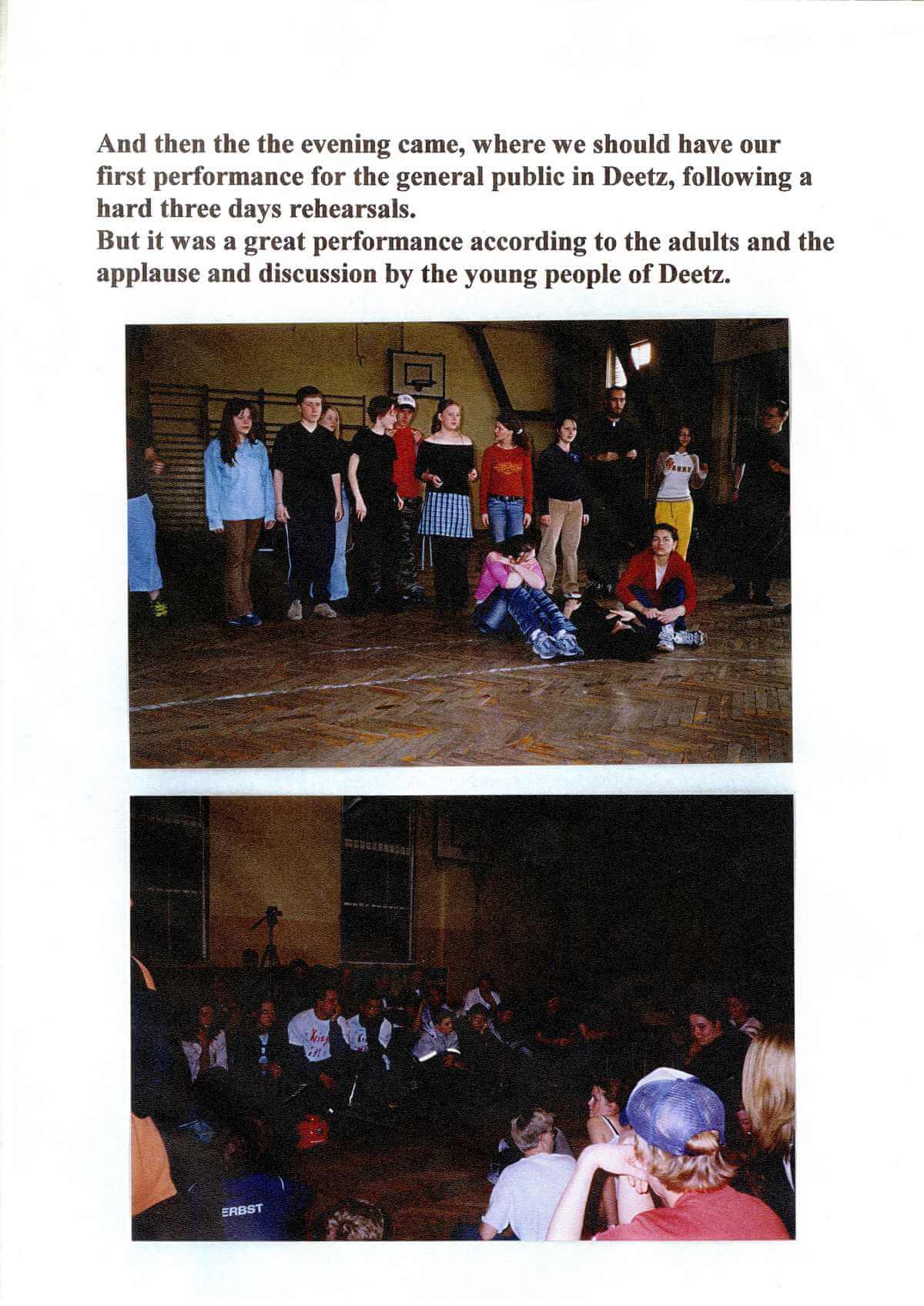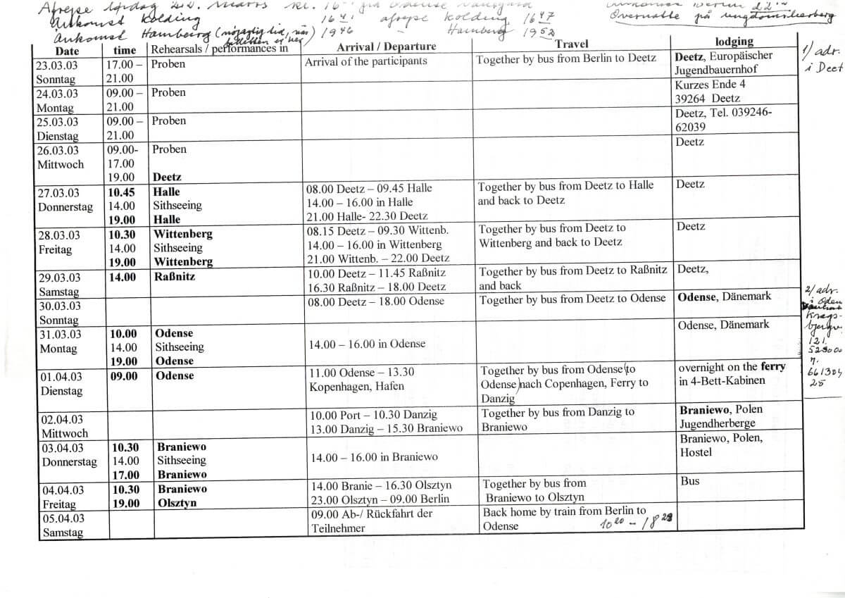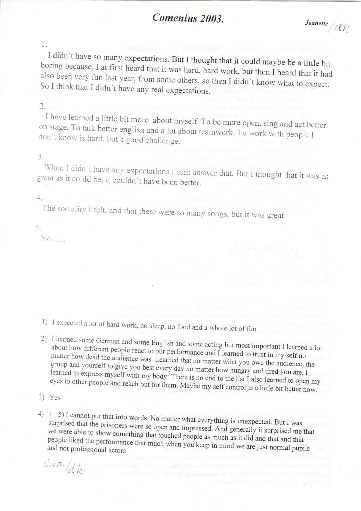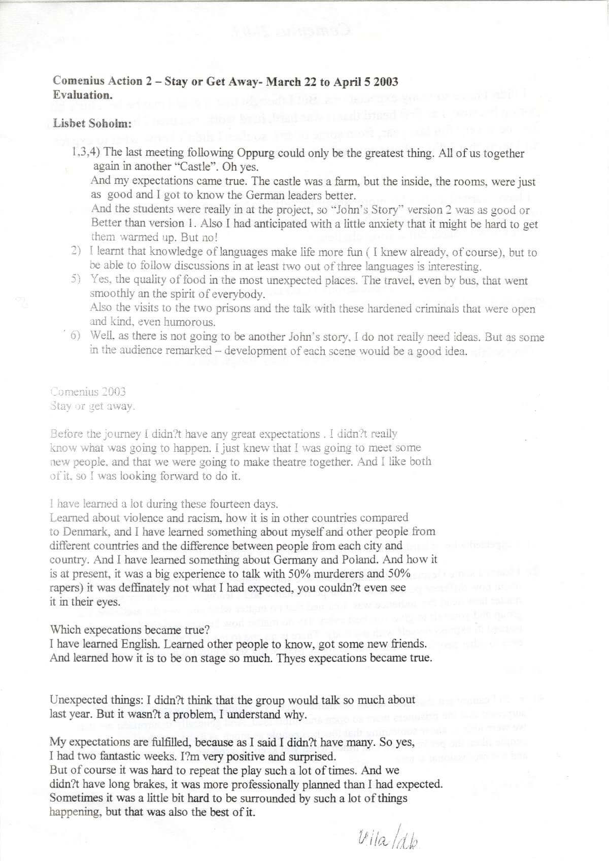 Die Projektleiter der Partnerschulen treffen sich regelmäßig in einem der Partnerländer aus Anlass solcher Aufführungen. Dabei werden die Ergebnisse analysiert und die Erfahrungen für die nächsten Arbeitsabschnitte abgesprochen.