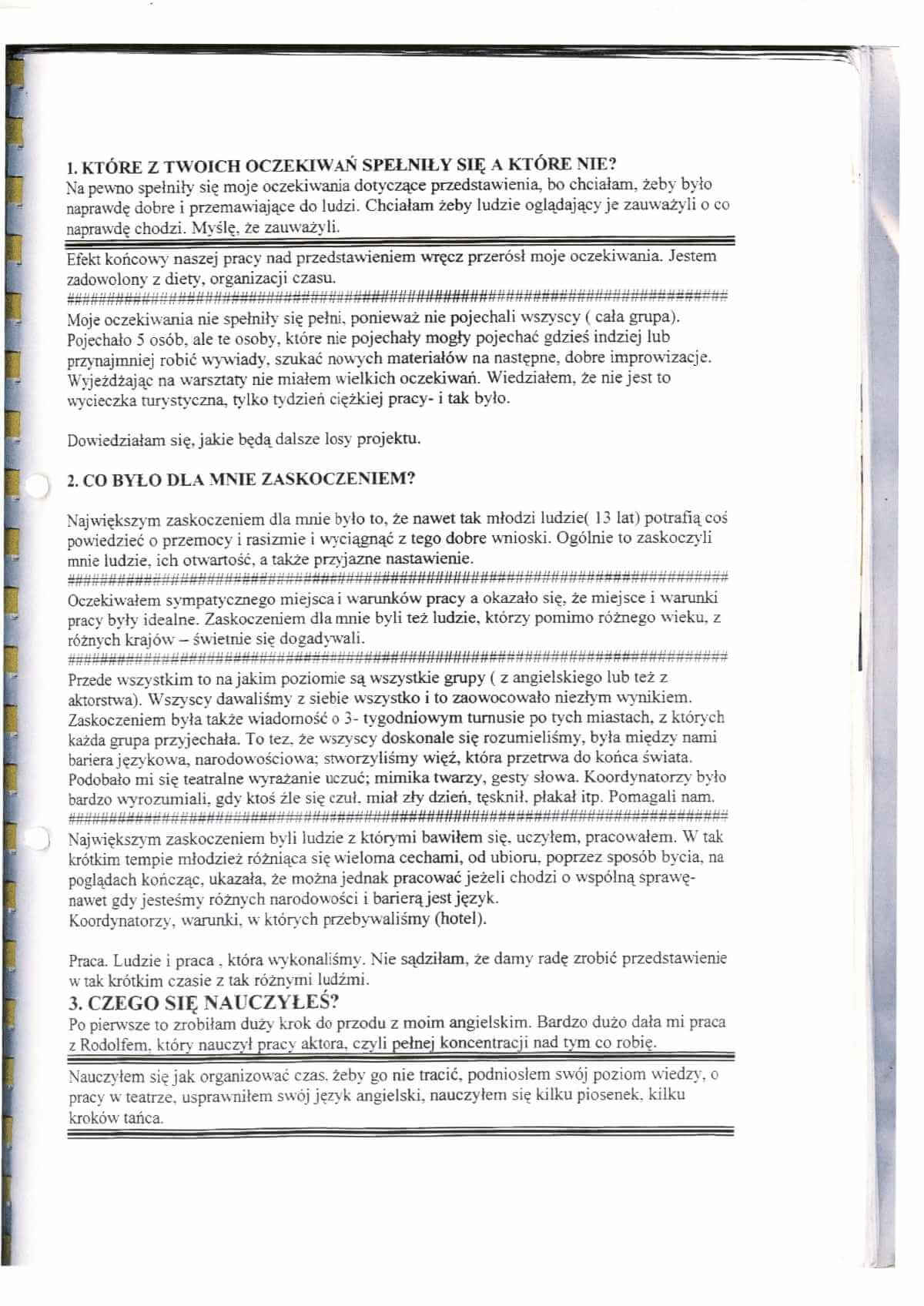 Aus den Antworten und daraus erarbeiteten Materialien werden Ideen geschöpft und kurze Theaterszenen, Rapsongs, Choreographien, Performances usw. entwickelt. Dann werden Aufführungen, Konzerte und Ausstellungen organisiert, wozu Personen auch außerhalb der Schule eingeladen werden.